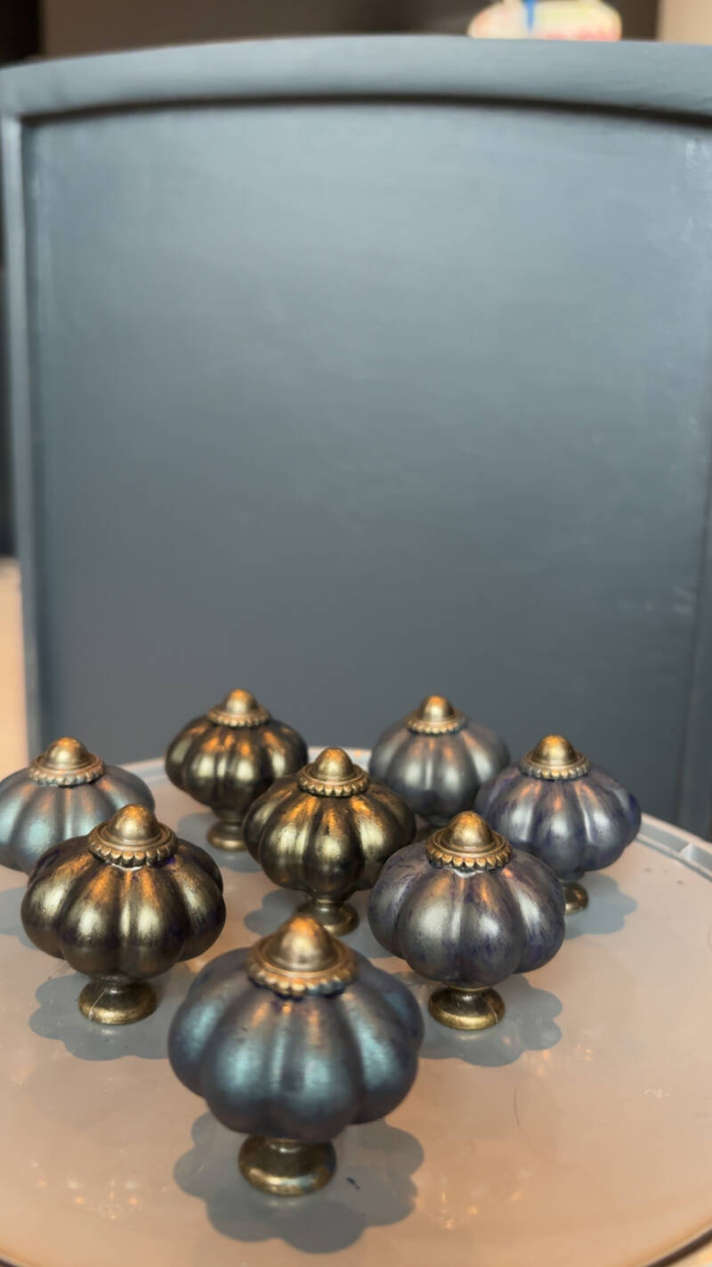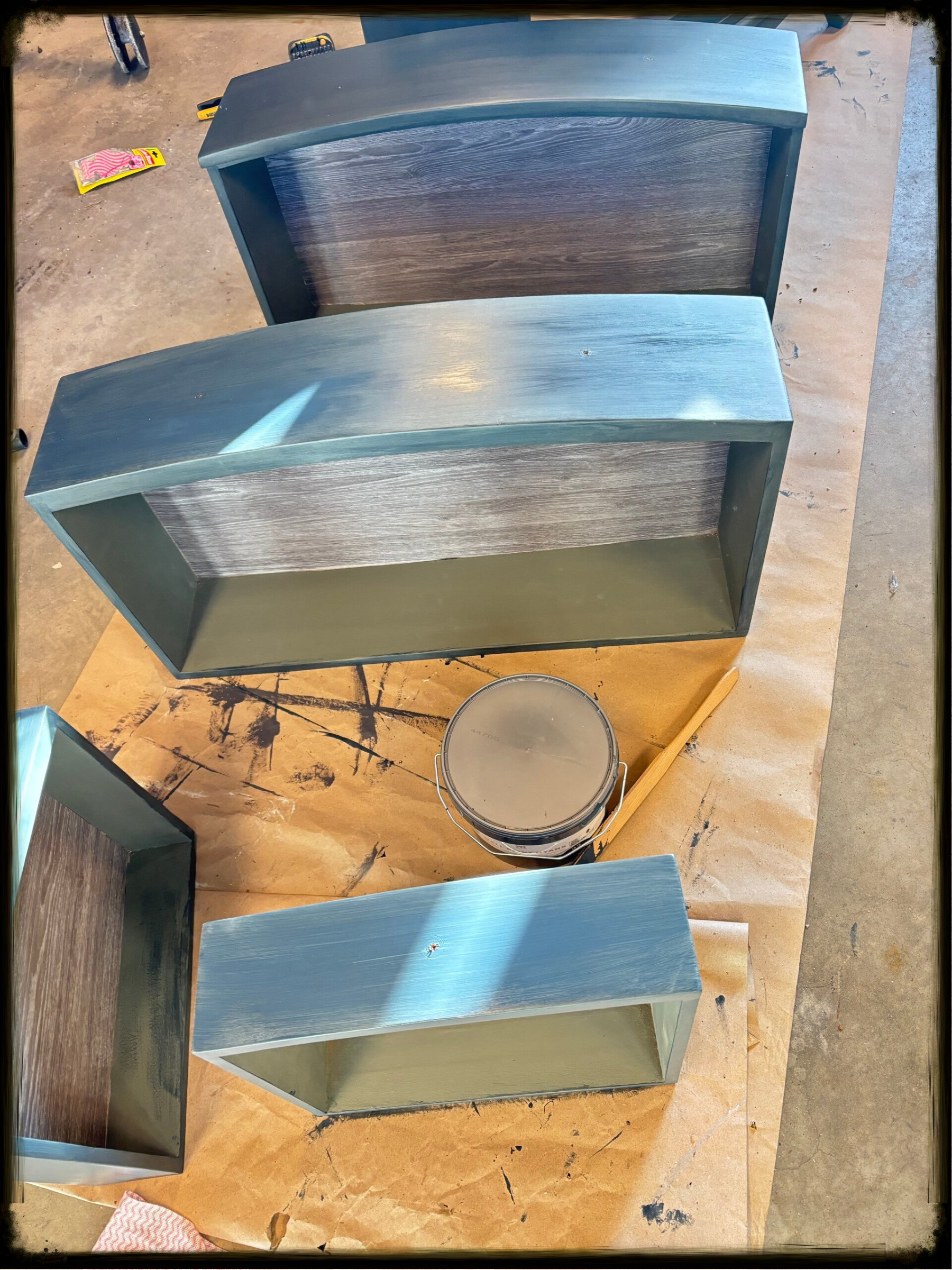 Male, male… denne malingen dekket ikke like godt, så må flere strøk til før ferdig, og jeg prøvde å blande inn et skimmer-pulver i malingen for skimrende effekt. Måtte pusses vekk igjen og nå klar for enda flere strøk!