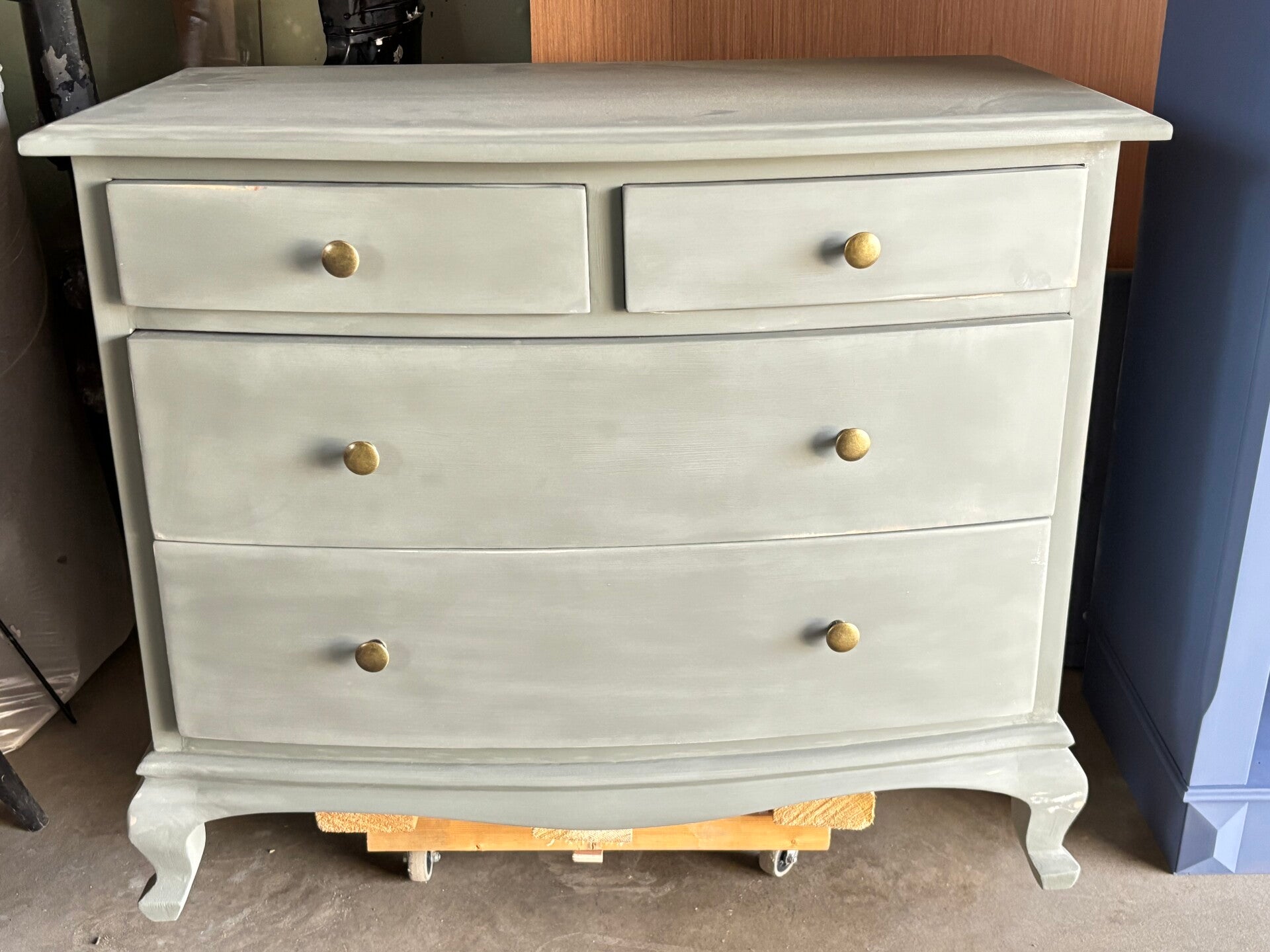 Utsiden av skapet er malt med en bronsefarget metallisk dekormaling.